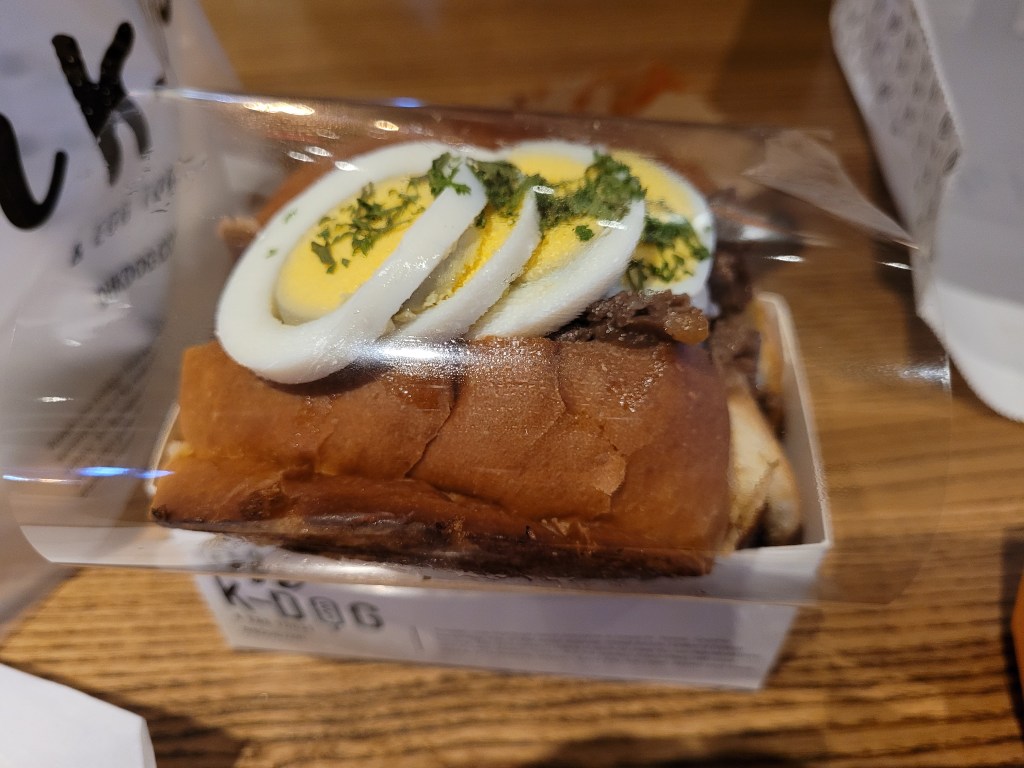 This was the second time I ate a Korean corn dog and I thought this time was not as tasty. The previous time had really good seasoning and this one I put the seasoning on. I also should’ve chosen an option with mozzarella cheese because that would’ve added more flavor. I did not expect the teriyaki toast to have beef in it. Like I thought it was going to just be teriyaki sauce with egg and other ingredients. The beef was tasty and the bread was oily and buttery. The eggs on the top were not enough, I think if it was half egg half beef, I would’ve liked it better. The toast also seemed to have cheese in the bread or something that gave a more savory bite at the end. The cardboard that holds the toast should’ve also had perforations so then you can rip it apart and eat the remaining parts of the toast in a more convenient manner.