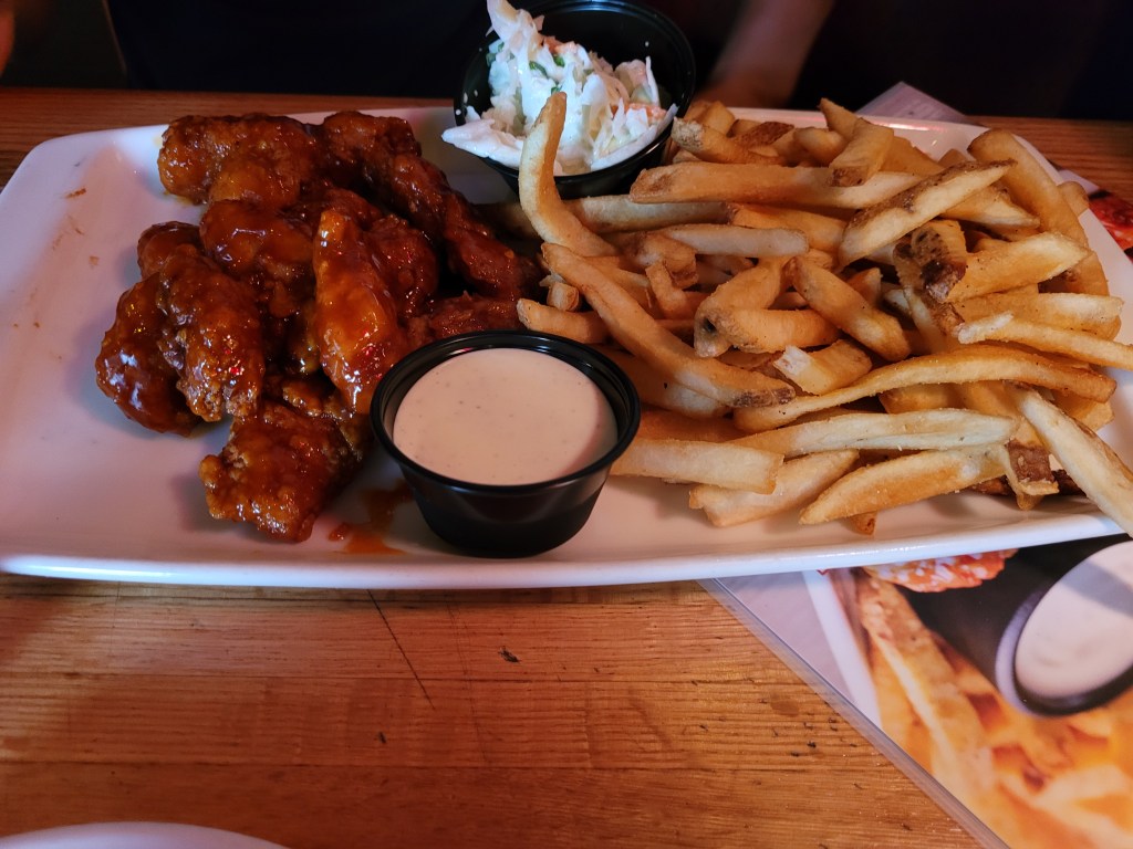 A friend mentioned that there was a deal at Applebee’s for all you can eat boneless chicken wings. So, we had to try it. Online, it mentioned that the price was 13.99, but when we went to the Times Square location, it turned out to be 19.99. There were only 6 available flavors and the first order each of us got had to be 10 pieces of a single sauce. The subsequent orders could be 5 pieces for a single sauce. We ordered all the sauces, Buffalo, Honey BBQ, Garlic Parm, Sweet Asian Chile, Extra Hot Buffalo, and Honey Pepper.